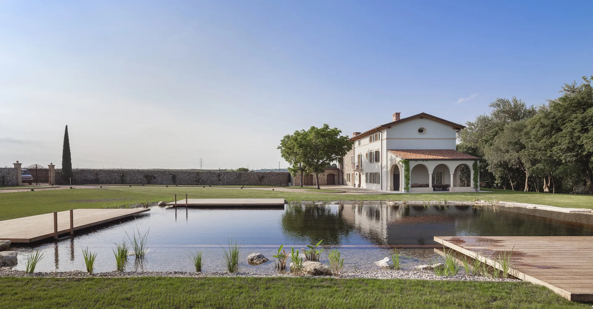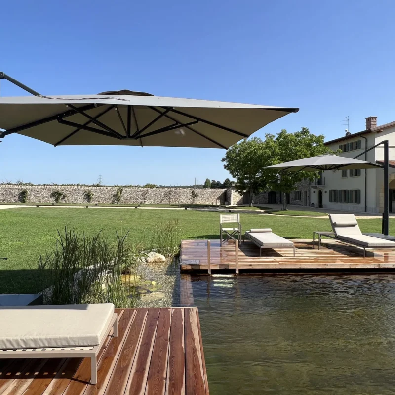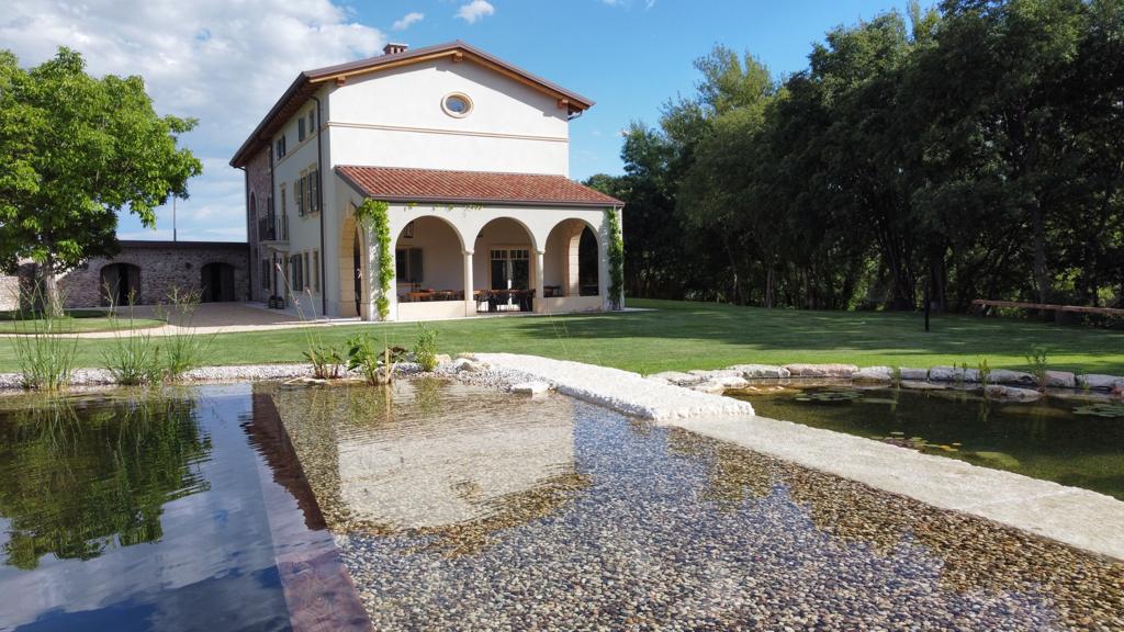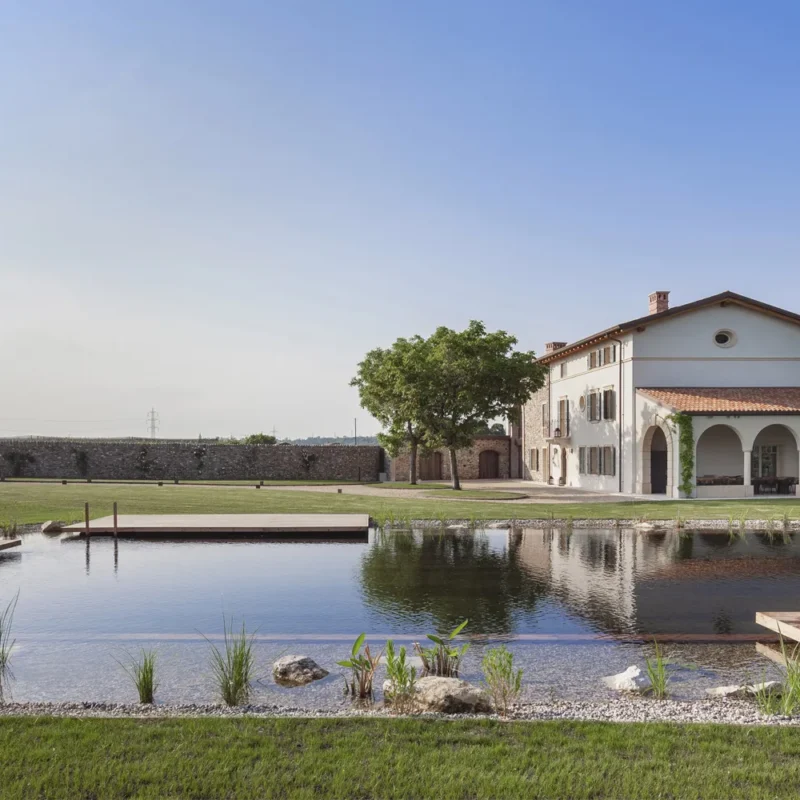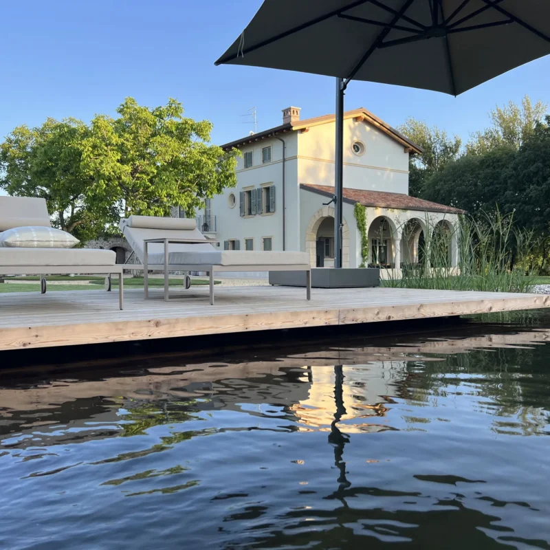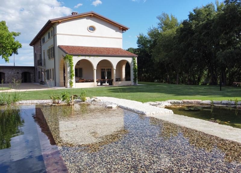 Biopiscina scenografica nella campagna veneta, pensata per il turismo di fascia alta